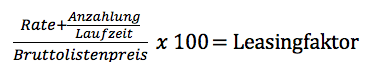 ((Leasingrate + (Nebenkosten / Laufzeit)) / Bruttolistenpreis) * 100 = Gesamtkostenfaktor